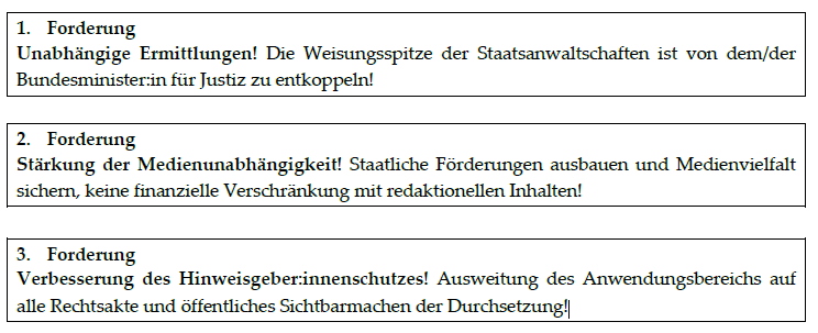 Vor diesem Hintergrund bekräftigt Transparency International Austria seine „Zehn Forderungen an die Bundesregierung“ (November 2024). Diese enthalten wirksame Maßnahmen zur Korruptionsprävention – darunter unabhängige Ermittlungen, die Sicherung der Medienfreiheit sowie ein effektiver Hinweisgeber:innenschutz (abrufbar unter: 10-Forderungen-an-die-neue-Regierung-.pdf).